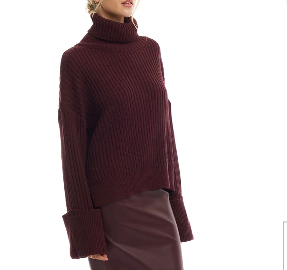 Stay warm and stylish with this elegant ribbed turtleneck sweater in a rich burgundy hue. Crafted from a soft, cozy knit, this sweater is designed with a relaxed fit and oversized cuffs for a contemporary twist on a classic style. The high turtleneck provides extra warmth, making it perfect for chilly days, while the deep, sophisticated color adds a luxurious touch to your winter wardrobe. Pair it with leather skirts, tailored pants, or jeans for a versatile, chic look. Ideal for both work and casual outings, this sweater is a must-have for cold-weather fashion.