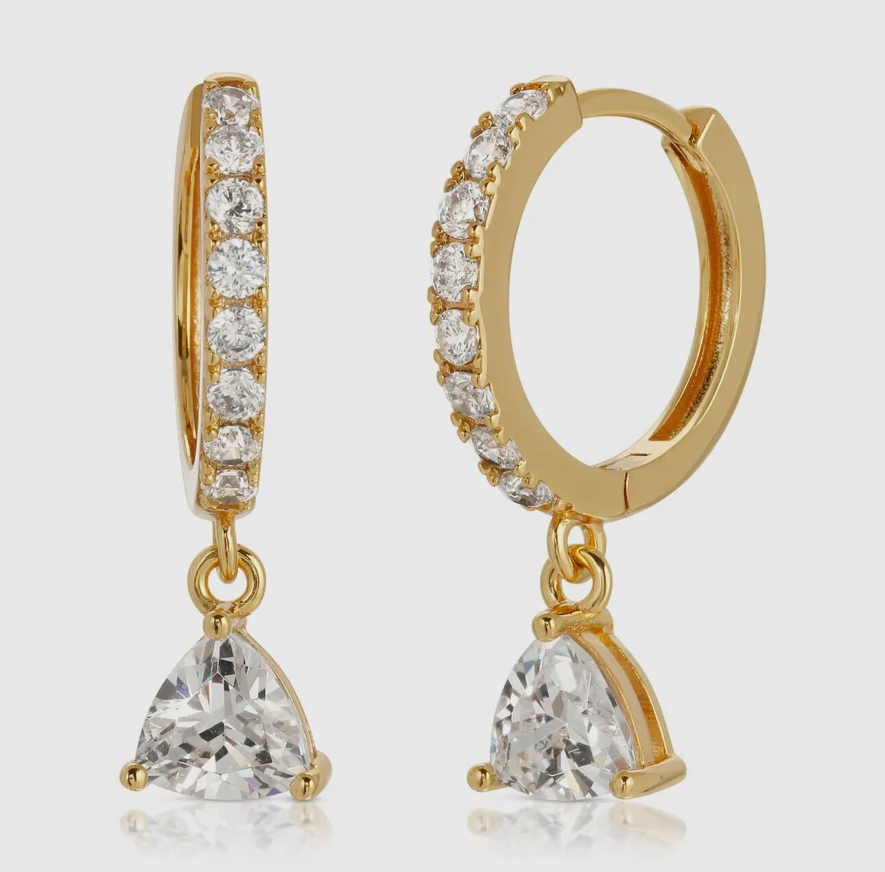 These Lucy Huggie Hoops are 14k gold plated CZ huggie earrings featuring a dazzling trillion drop CZ. Perfect for any occasion, these earrings add a touch of elegance to your look.