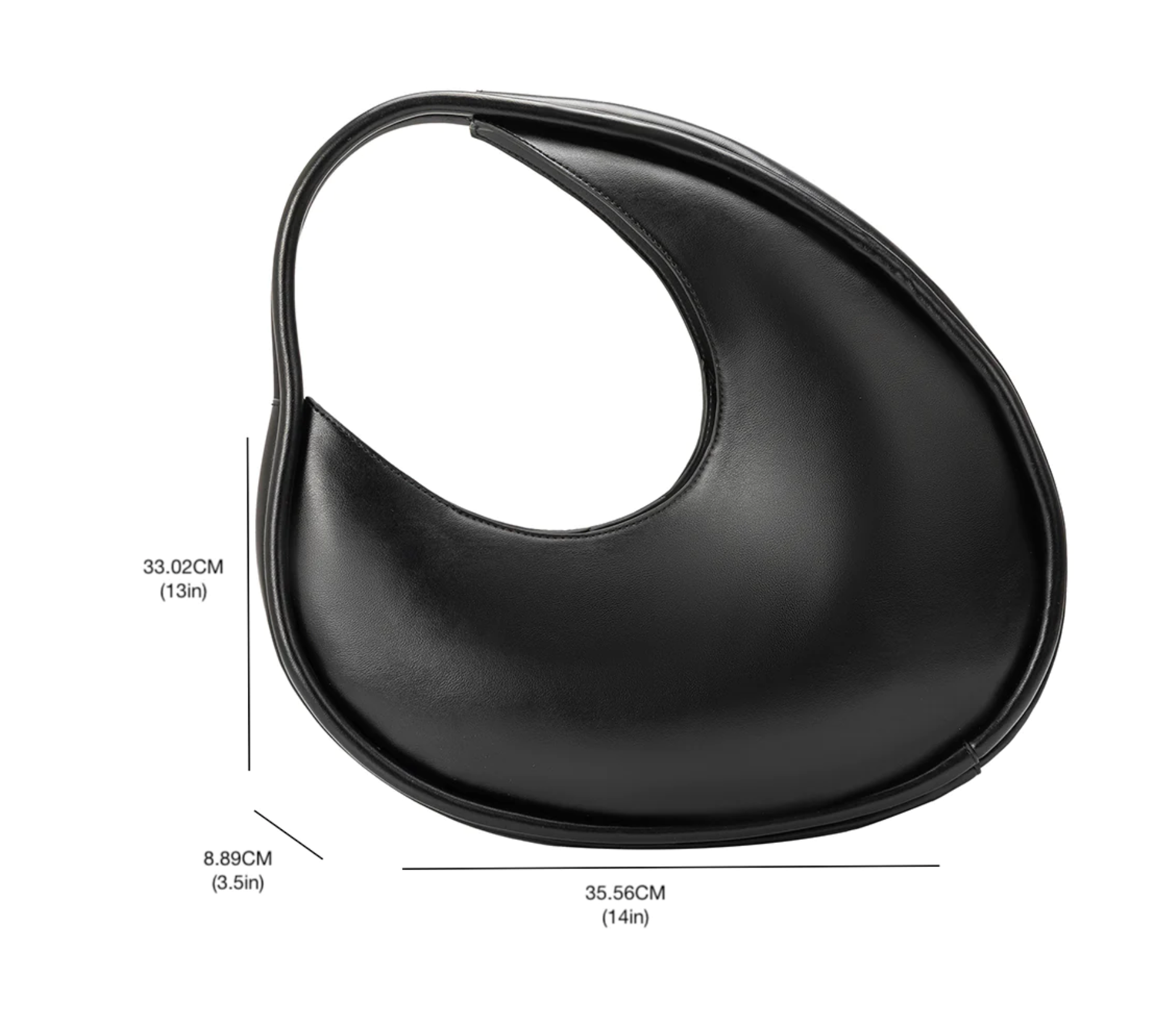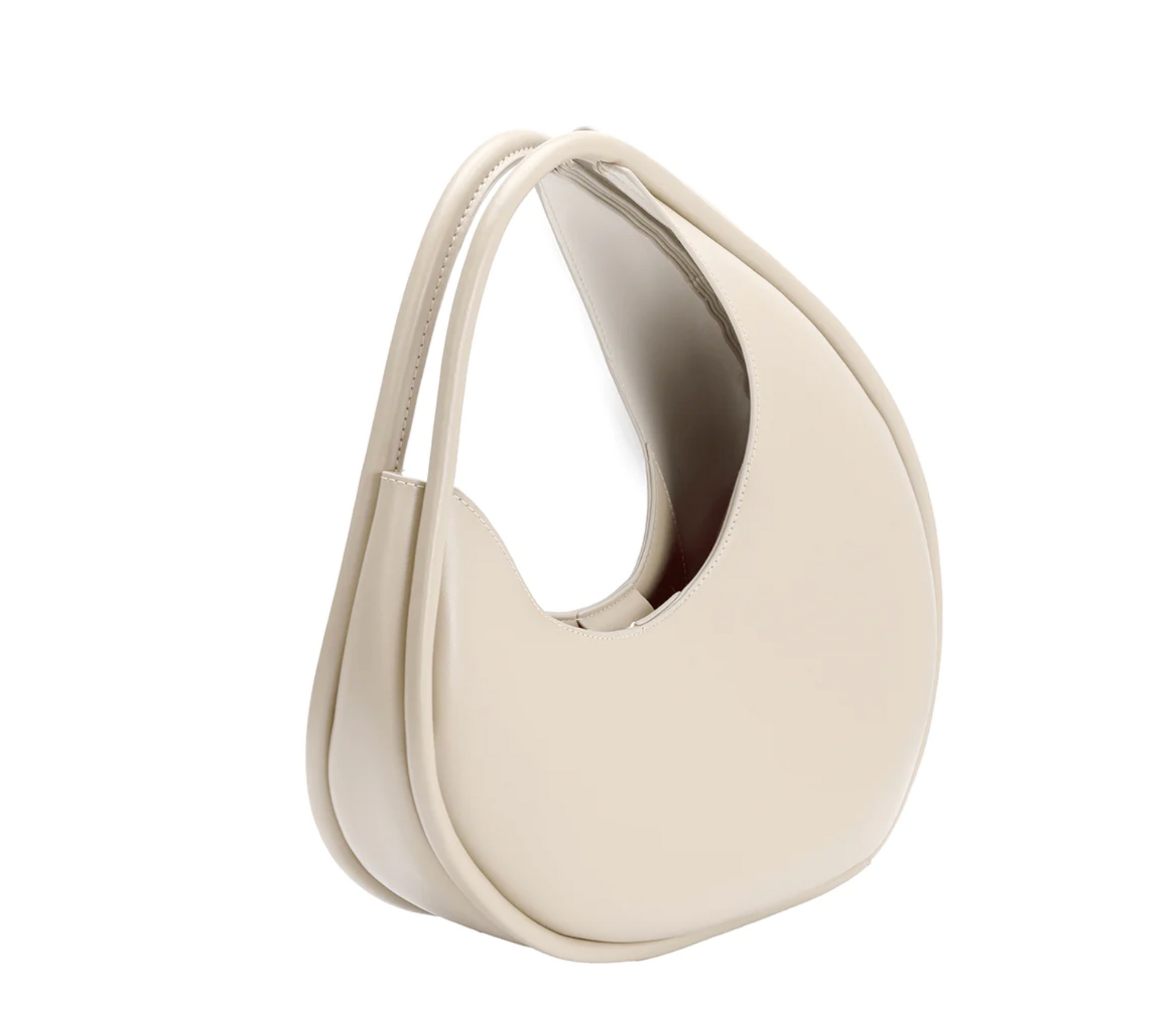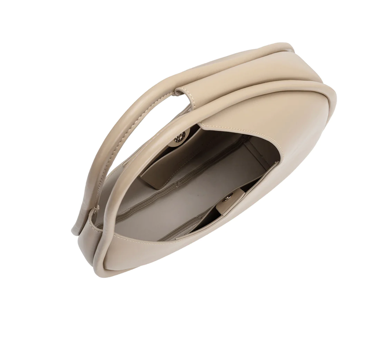 Introducing Nikki a unique circular asymmetrical shoulder bag made with recycled vegan leather. The double piping structured handles give this handbag its unique shape and feel. With a spacious interior, you can fit your everyday essentials like a phone, wallet, keys, sunglasses, and makeup.
