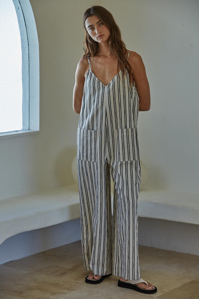 Introducing our Black Linen Striped Jumpsuit –Crafted from breathable cotton linen, this jumpsuit features a flattering V-neck, spaghetti straps, and convenient pockets. The timeless black color with subtle stripes adds sophistication, making it your go-to choice for both casual and fashionable occasions. Elevate your wardrobe effortlessly with this versatile and on-trend jumpsuit.